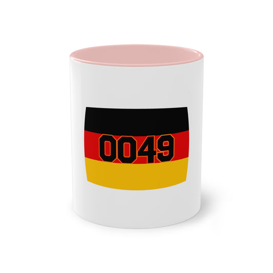 Stolzte 0049 auf Deutschland - auf Kaffeetassen, Teetassen bedruckt; weißer Außenbereich mit mehrfarbigem Innenbereich und Henkel, große; 11 Unzen