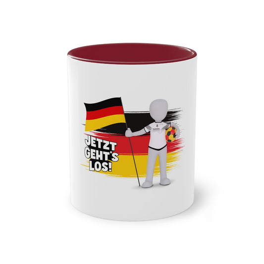 Jetzt geht's los auf Kaffeetassen bedruckt; weißer Außenbereich mit mehrfarbigem Innenbereich und Henkel, große; 11 Unzen