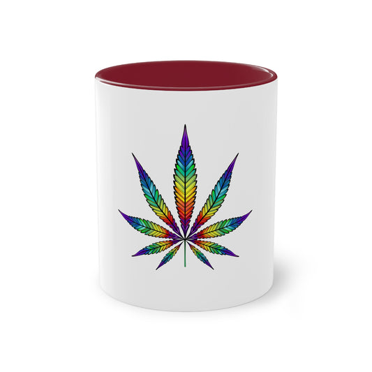 Regenbogen Weed, für Vielfalt, Verständnis und Akzeptanz auf Kaffeetassen bedruckt; weißer Außenbereich mit mehrfarbigem Innenbereich und Henkel, große; 11 Unzen