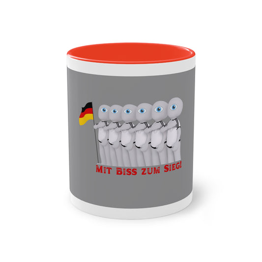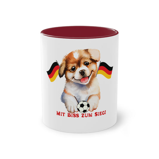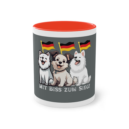 Mit bis zum Sieg für Deutschland auf Kaffeetassen bedruckt; weißer Außenbereich mit mehrfarbigem Innenbereich und Henkel, große; 11 Unzen