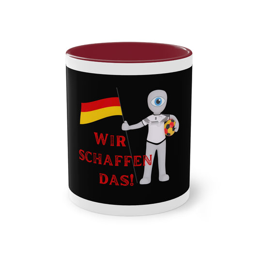 Wir schaffen das! - für Deutschland auf Kaffeetassen bedruckt; weißer Außenbereich mit mehrfarbigem Innenbereich und Henkel, große; 11 Unzen