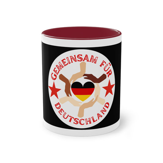 Gemeinsam für Deutschland auf Kaffeetassen bedruckt; weißer Außenbereich mit mehrfarbigem Innenbereich und Henkel, große; 11 Unzen