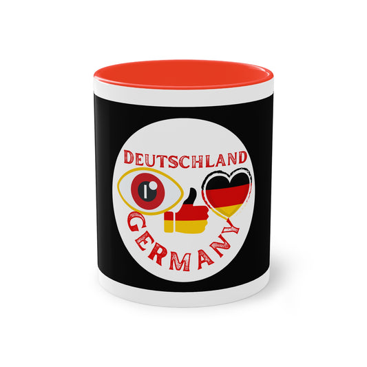 I Love Germany auf Kaffeetassen bedruckt; weißer Außenbereich mit mehrfarbigem Innenbereich und Henkel, große; 11 Unzen