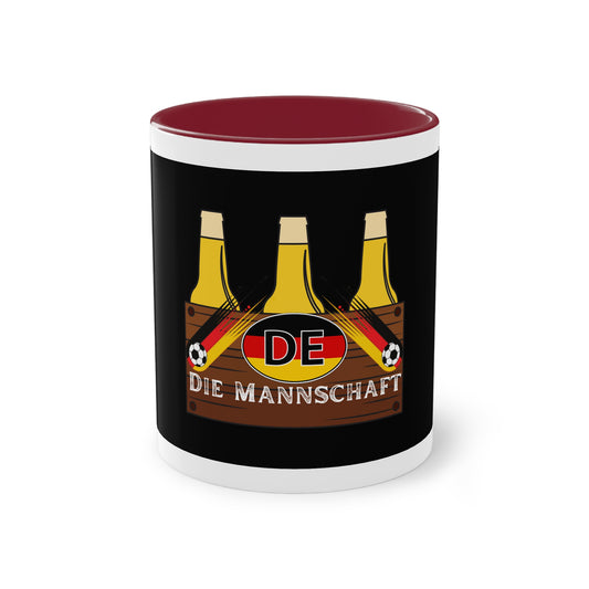 Die Mannschaft für Deutschland auf Kaffeetassen bedruckt; weißer Außenbereich mit mehrfarbigem Innenbereich und Henkel, große; 11 Unzen