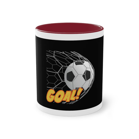 Mit bis zum Ziel für Deutschland auf Kaffeetassen bedruckt; weißer Außenbereich mit mehrfarbigem Innenbereich und Henkel, große; 11 Unzen