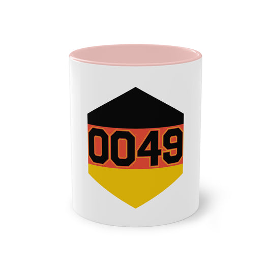 0049 für Deutschland auf Kaffeetassen, Teetassen bedruckt; weißer Außenbereich mit mehrfarbigem Innenbereich und Henkel, große; 11 Unzen