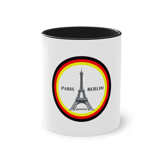 Berlin, Paris, London auf Kaffeetassen bedruckt; weißer Außenbereich mit mehrfarbigem Innenbereich und Henkel, große; 11 Unzen