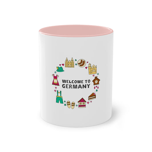 Willkommen in Deutschland, auf Kaffeetassen bedruckt, weißer Außenbereich mit mehrfarbigem Innenbereich und Henkel, große; 11 Unzen