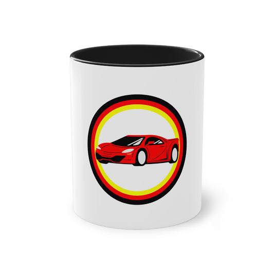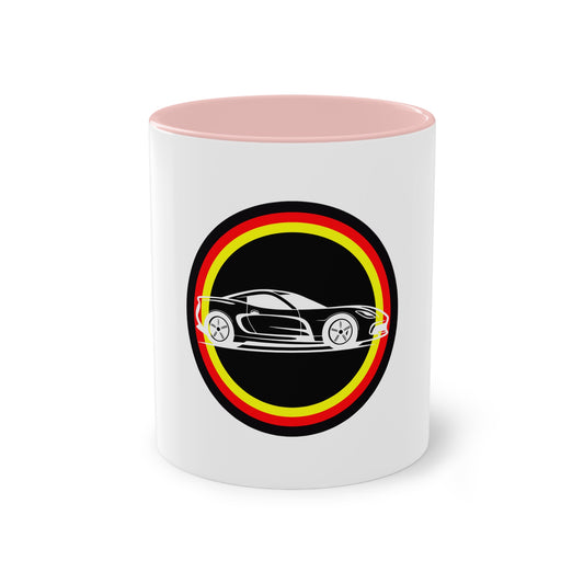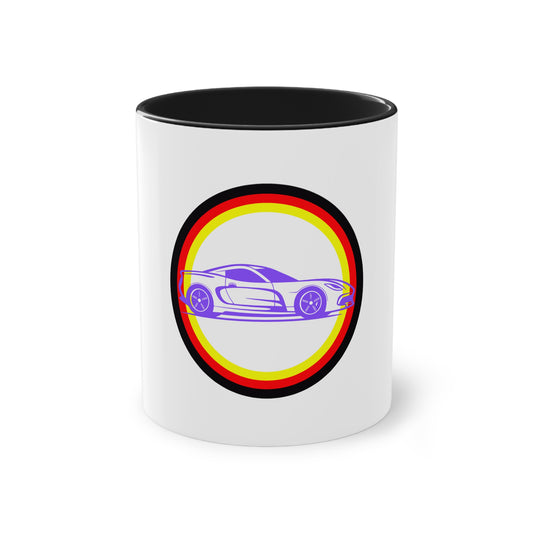 Mit Vollgas genießen: Deutsche Auto-Kaffeetassen; weißer Außenbereich mit mehrfarbigem Innenbereich und Henkel, große; 11 Unzen