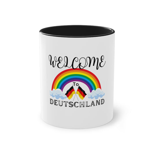 Welcome to Deutschland, Regenbogen , für Vielfalt, Verständnis und Akzeptanz auf Kaffeetassen bedruckt; weißer Außenbereich mit mehrfarbigem Innenbereich und Henkel, große; 11 Unzen