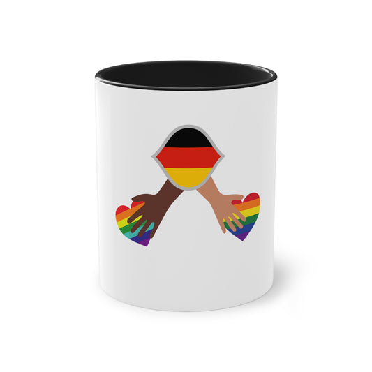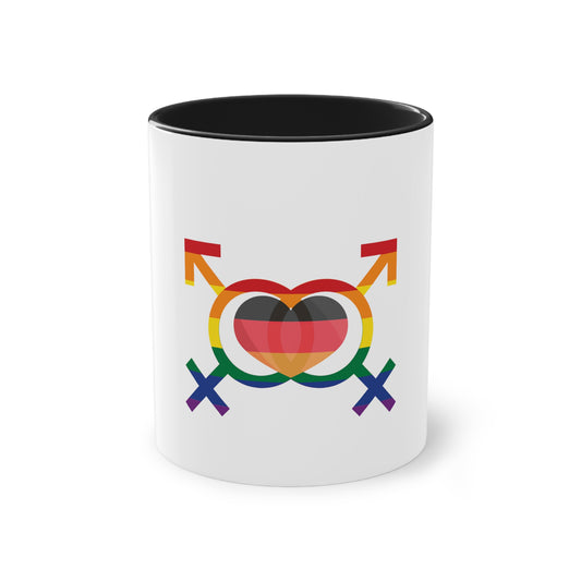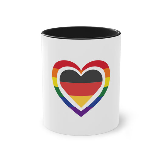 Regenbogen Liebe für Deutschland, für Vielfalt, Verständnis und Akzeptanz auf Kaffeetassen bedruckt; weißer Außenbereich mit mehrfarbigem Innenbereich und Henkel, große; 11 Unzen