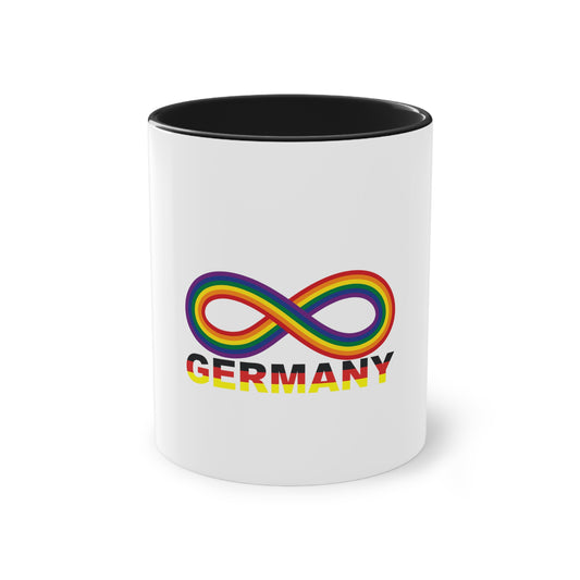 Regenbogen Infinity für Deutschland, für Vielfalt, Verständnis und Akzeptanz auf Kaffeetassen bedruckt; weißer Außenbereich mit mehrfarbigem Innenbereich und Henkel, große; 11 Unzen