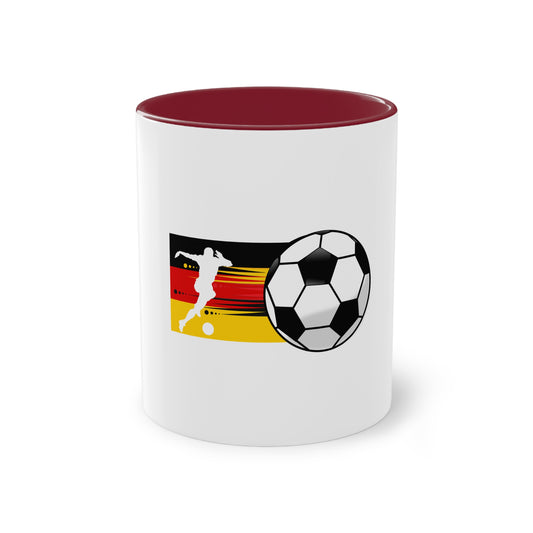 Die wahre Leidenschaft für Fußball auf Kaffeetassen bedruckt; weißer Außenbereich mit mehrfarbigem Innenbereich und Henkel, große; 11 Unzen