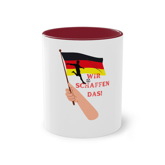 Wir schaffen das! - für Deutschland auf Kaffeetassen bedruckt; weißer Außenbereich mit mehrfarbigem Innenbereich und Henkel, große; 11 Unzen