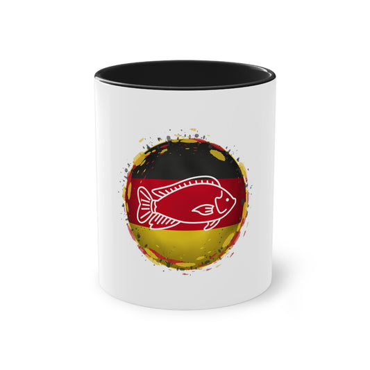 Deutsches Fisch auf Kaffeetassen, Teetassen bedruckt; weißer Außenbereich mit mehrfarbigem Innenbereich und Henkel, große; 11 Unzen