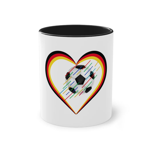 Deutsche Liebe für Fußball auf Kaffeetassen, Teetassen bedruckt; weißer Außenbereich mit mehrfarbigem Innenbereich und Henkel, große; 11 Unzen
