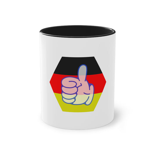 Thumbs-up für Deutschland auf Kaffeetassen, Teetassen bedruckt; weißer Außenbereich mit mehrfarbigem Innenbereich und Henkel, große; 11 Unzen