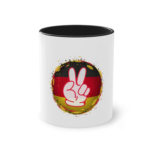 Peace für Deutschland auf Kaffeetassen, Teetassen bedruckt; weißer Außenbereich mit mehrfarbigem Innenbereich und Henkel, große; 11 Unzen