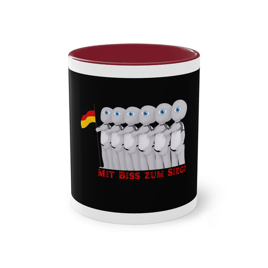 Deutschland mit bis zum Sieg auf Kaffeetassen bedruckt; weißer Außenbereich mit mehrfarbigem Innenbereich und Henkel, große; 11 Unzen