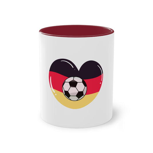 Ich liebe Deutschland's Fußball auf Kaffeetassen bedruckt; weißer Außenbereich mit mehrfarbigem Innenbereich und Henkel, große; 11 Unzen